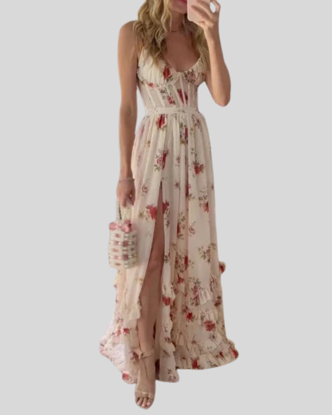 Modehus | Blomsterkjole med hjerteutskjæring og høy splitt
