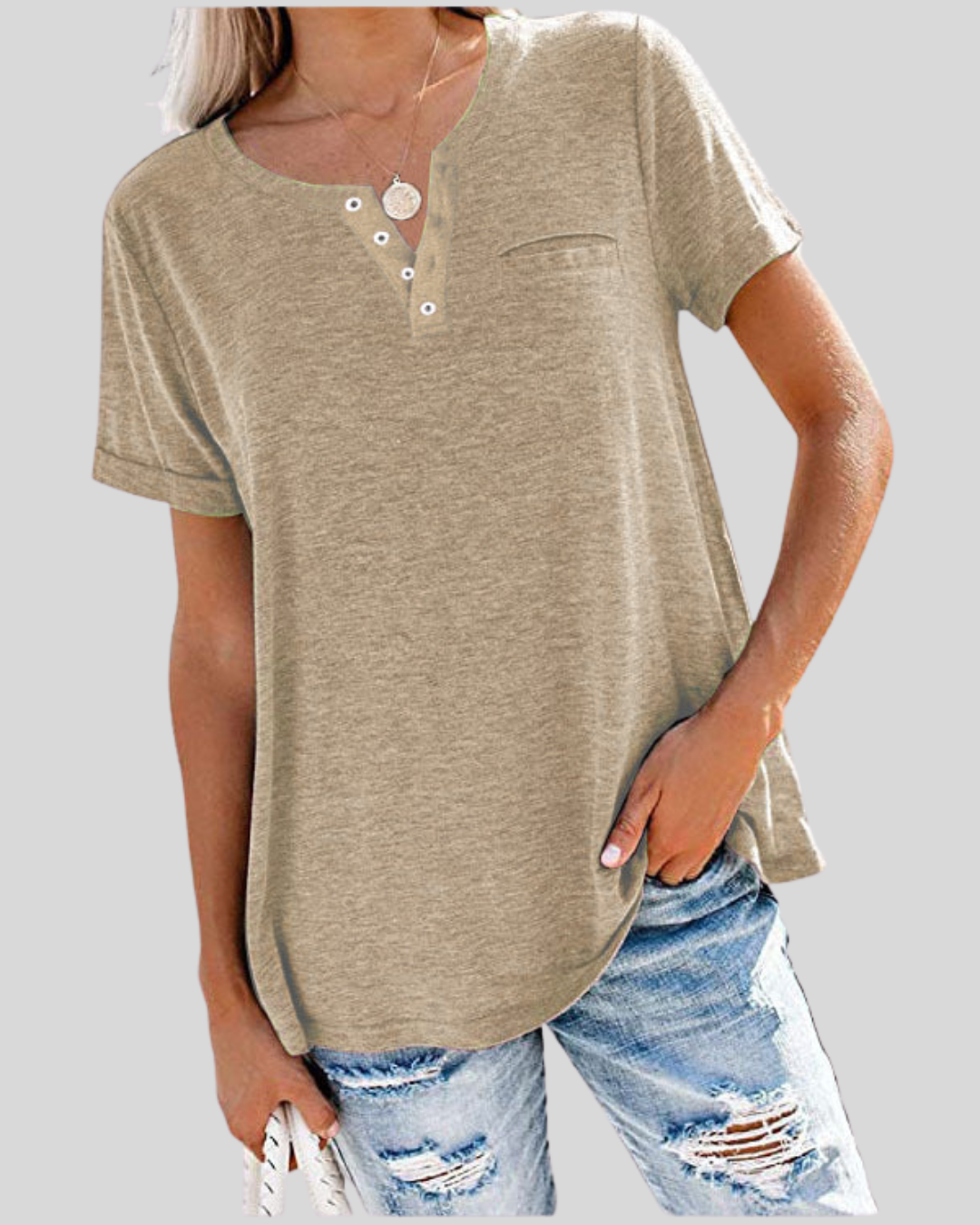 Klassisk V-hals med knappdetalj som gir en feminin touch