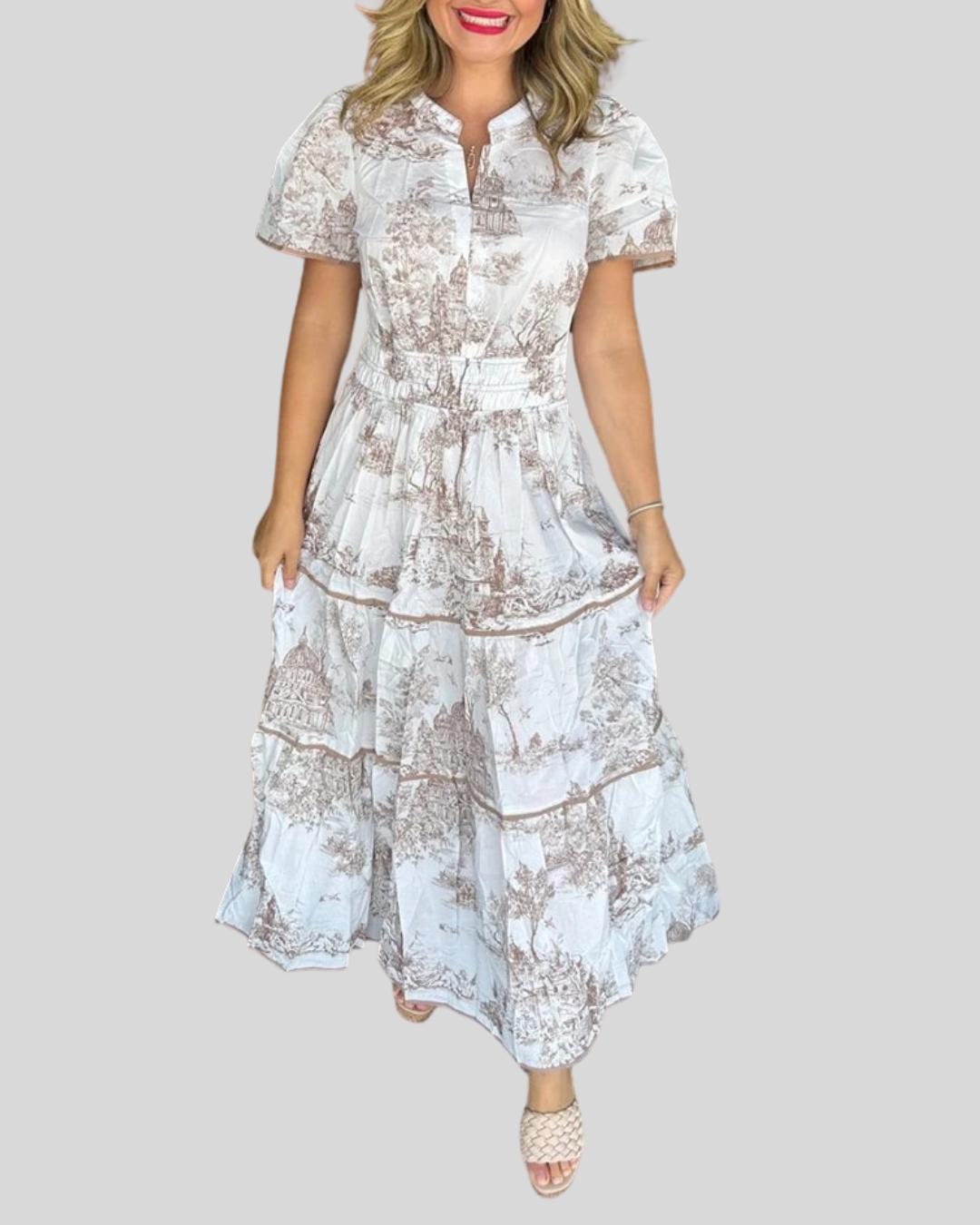Den rynkete midjen og det lagdelte skjørtet skaper en elegant silhuett, mens den myke V-halsen og de korte ermene tilfører et preg av raffinement.
