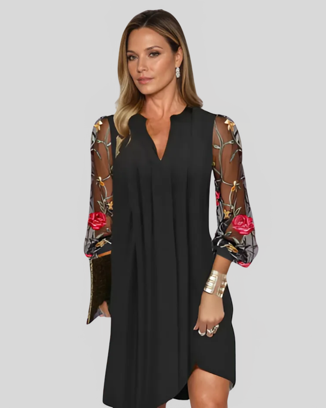 Denne kjolen kombinerer enkelhet med spesielle detaljer for å skape noe virkelig unikt. Det myke stoffet glir over huden, mens de blomstermønstrede gjennomsiktige ermene hever utseendet med et snev av romantikk. Ideell for å kle seg elegant uten å overdrive.