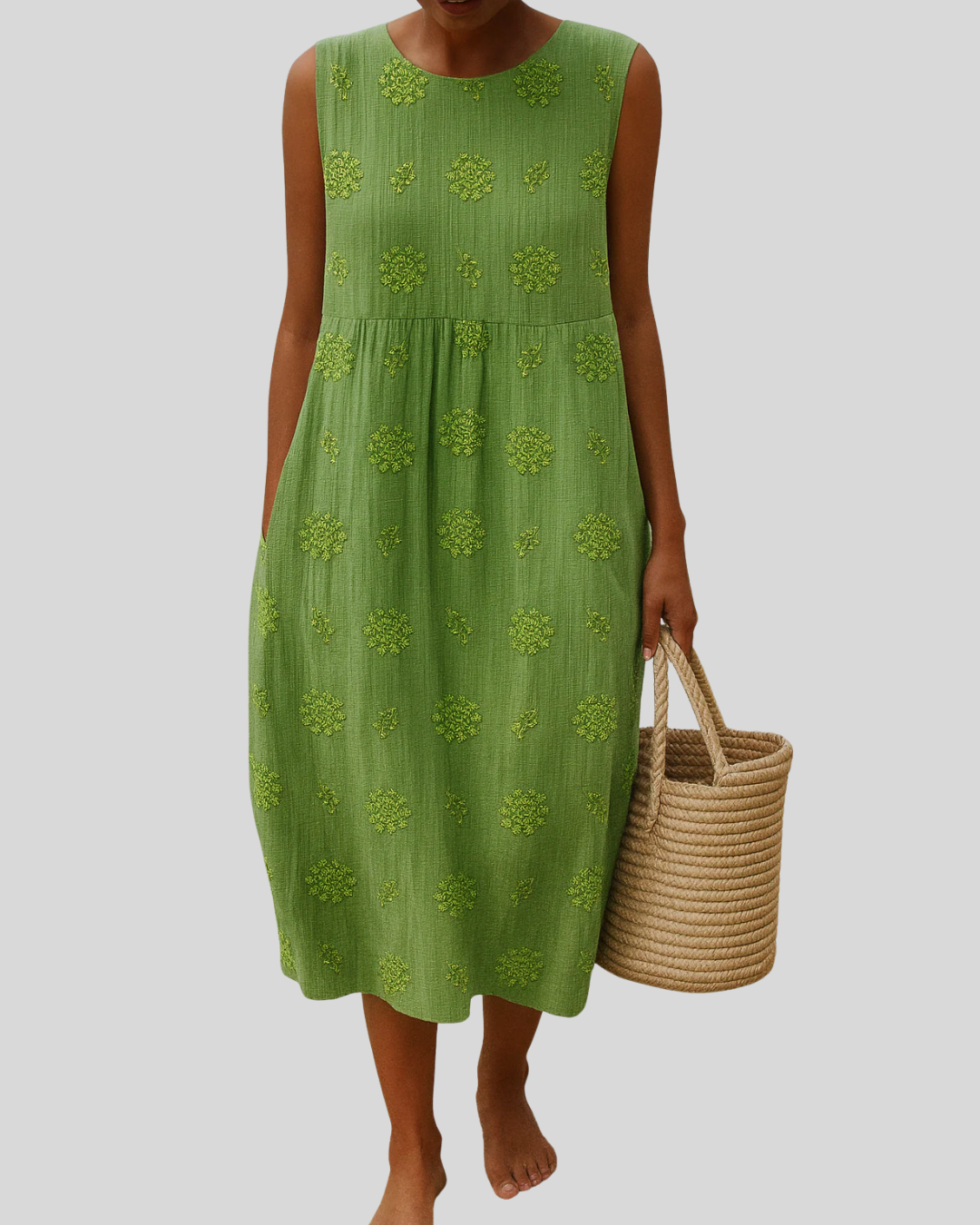 Oppdag skjønnheten og komforten med vår ermeløse midikjole, perfekt for enhver anledning fra brunch til strandturer. Den myke blomstertrykket tilfører sjarm, mens det lette bomull-lin stoffet gir pusteevne og flyt.